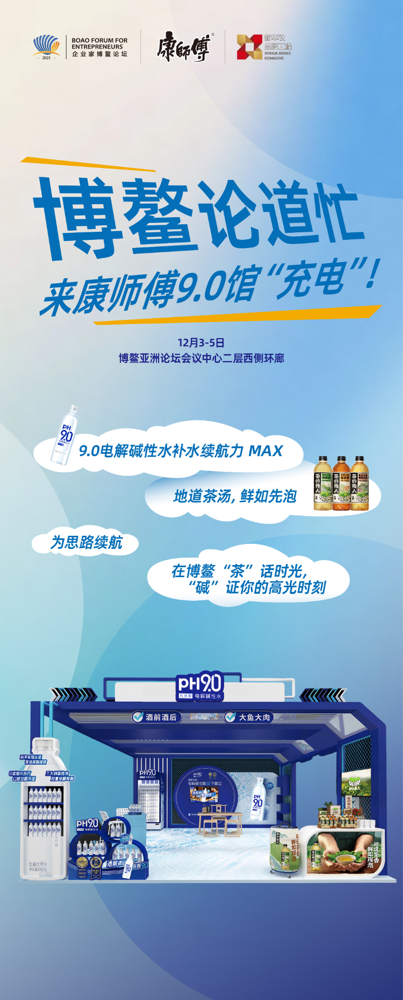 由新华社品牌工作办公室、新华网主办的2025企业家博鳌论坛系列活动将于12月2日至5日在海南博鳌举办。连续七年参与论坛的“老朋友”康师傅今年首次打造“康师傅饮品馆”,以全新升级的“9.0碱性水展馆”亮相,为参会嘉宾带来集健康饮水知识、茶文化体验与创意互动于一体的沉浸式体验空间。